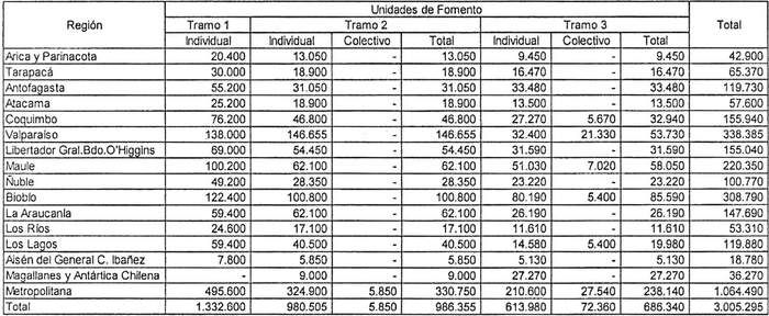 2°.- El monto de Unidades de Fomento (U.F.) que se destinarán al financiamiento del subsidio directo, conforme a las disposiciones del DS N° 1 (V. y U.), de 2011, y su distribución regional por modalidad, tramo, alternativa de postulación, se detalla en los cuadros que se presentan a continuación, pudiendo practicarse redistribuciones que serán sancionadas mediante resolución del Ministro de Vivienda y Urbanismo: