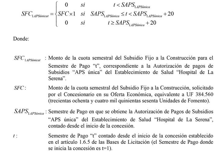 . El Ministerio de Salud, de acuerdo a lo indicado en el artículo 1.12.2.1 de las Bases de Licitación, pagará semestralmente al Concesionario, para el Establecimiento de Salud "Hospital de La Serena", 20 (veinte) cuotas correspondientes al Subsidio Fijo a la Construcción. El valor de las cuotas se determinará de acuerdo a la siguiente expresión: