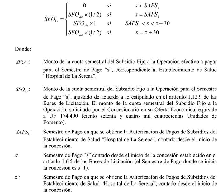 . El Ministerio de Salud, de acuerdo a lo indicado en el artículo 1.12.2.2 de las Bases de Licitación, pagará semestralmente al Concesionario, para el Establecimiento de Salud "Hospital de La Serena", cuotas anticipadas correspondientes al Subsidio Fijo a la Operación, que se determinarán de acuerdo a la siguiente expresión: