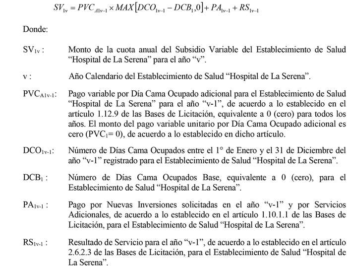 . El Ministerio de Salud, de acuerdo a lo señalado en el artículo 1.12.2.3 de las Bases de Licitación, pagará anualmente al Concesionario, para el Establecimiento de Salud "Hospital de La Serena", cuotas anuales vencidas correspondientes al Subsidio Variable, de acuerdo a la siguiente expresión: