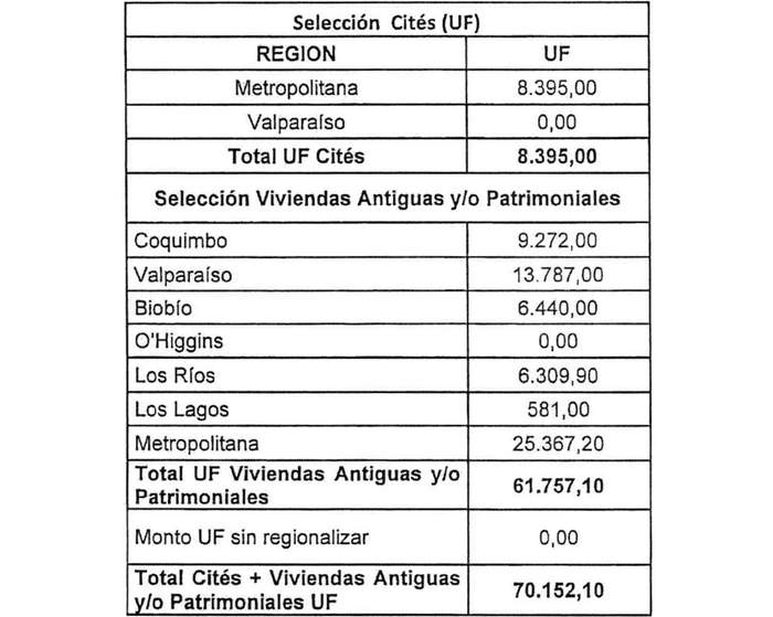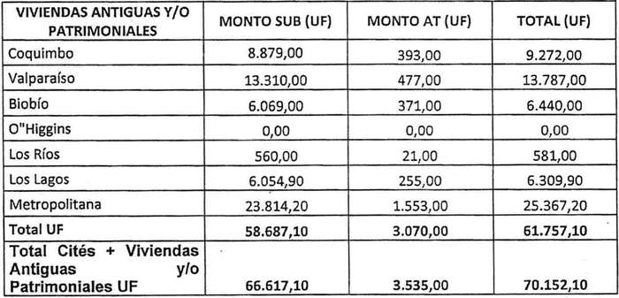 2. Apruébanse los recursos disponibles para los procesos correspondientes a la selección del Llamado a postulación del Programa de Protección del Patrimonio Familiar, Título II, destinado a la atención de familias que residan cité, viviendas Antiguas y/o Patrimoniales emplazadas en zonas típicas y/o zonas de conservación histórica de las regiones que se indican a continuación, los que se destinarán al financiamiento de los subsidios y al pago de los servicios de Asistencia Técnica, según lo señalado en el siguiente cuadro:
