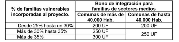 3.3. El monto del Bono de Integración Social para las familias de sectores medios será el indicado en la siguiente tabla, de acuerdo al porcentaje de familias vulnerables que considere el proyecto; los requisitos para su obtención y aplicación serán aquellos establecidos en el artículo 4°, letra b), del DS N° 19.
