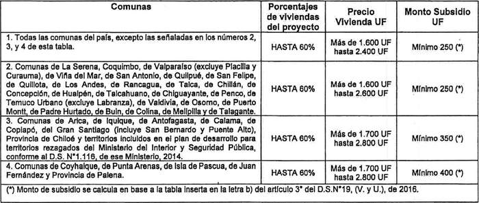 . Las comunas no incluidas en las tablas precedentes mantendrán los precios de vivienda y montos de subsidio según emplazamiento de la vivienda, de acuerdo a la tabla de la letra b) del artículo 3° del DS N° 19 (V. y U), de 2016.".