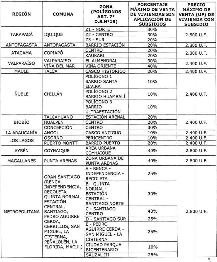 Los proyectos que se desarrollen en algunas de las 27 zonas definidas en las resoluciones exentas N° 1.219 de 2020, N° 466 y N° 1.414 de 2021 y sus modificaciones, todas de Vivienda y Urbanismo, de acuerdo a la letra c) del artículo 7° del DS N° 19 (V. y U.), de 2016, podrán considerar porcentajes de vivienda para venta sin aplicación de subsidio cuyo precio exceda de los máximos indicados en la letra a) del artículo 7° del decreto precitado, según lo indicado en la siguiente tabla:
