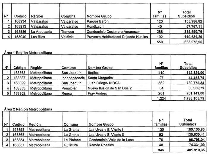 La letra b) del numeral 1 de la Resolución 1892 Exenta, Vivienda, publicada el 16.11.2023, modifica la presente norma en el sentido de reemplazar en el cuadro inserto en el resuelvo 4 la cuarta fila, correspondiente a la Región de Los Ríos y la séptima fila, correspondiente al "Total", por las filas que la citada norma indica.