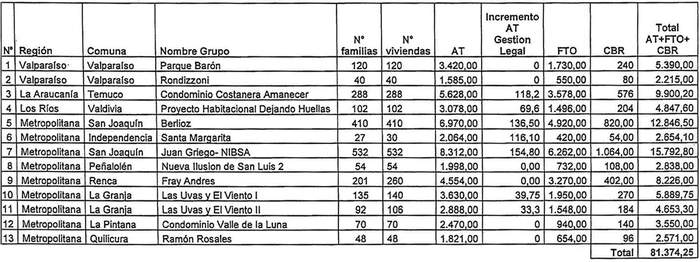 3. Asígnase a los grupos organizados seleccionados en el Resuelvo 1. de la presente resolución exenta, por concepto de pago por los Servicios de Asistencia Técnica, por las Labores de Fiscalización Técnica de Obra y pago de Aranceles al Conservador de Bienes Raíces para el desarrollo de sus proyectos, los montos expresados en Unidades de Fomento que se detallan a continuación: