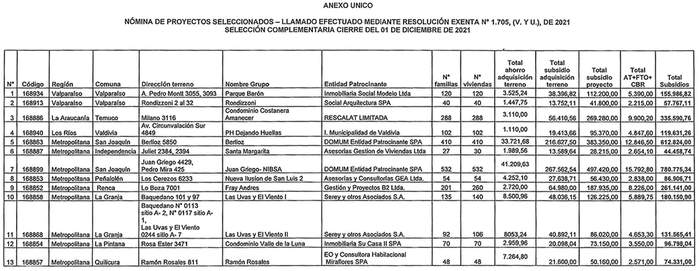 La letra c) del numeral 1 de la Resolución 1892 Exenta, Vivienda, publicada el 16.11.2023, modifica la presente norma en el sentido de reemplazar en el cuadro del Anexo Único la quinta fila correspondiente al numeral 4º, proyecto código 168940, por la fila que se indica en el cuadro adjunto como "Anexo Único" y que forma parte integrante de la citada resolución.