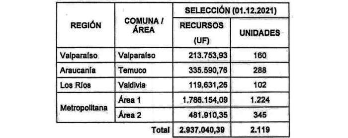4. Los recursos comprometidos en el Resuelvo 1. de la presente resolución exenta, para los proyectos seleccionados en el concurso a que se llamó por resolución exenta Nº 1.705 (V. y U.), de 2021, cuyo cierre de postulación se efectuó el día 1 de diciembre de 2021, se resumen en el siguiente cuadro para cada región del país, según corresponda, incluyendo la suma total de familias beneficiadas y Unidades de Fomento comprometidas, considerando los montos de subsidio de los proyectos, incluidos sus respectivos Servicios de Asistencia Técnica, Fiscalización Técnica de Obras y aranceles del Conservador de Bienes Raíces: