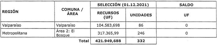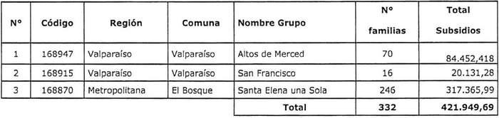2. Apruébase la selección de los grupos organizados indicados en la siguiente tabla, con su respectivo financiamiento total, el cual incluye los servicios de asistencia técnica, fiscalización técnica de obras y aranceles del Conservador de Bienes Raíces, detallados en el resuelvo 4., para el otorgamiento de subsidios del Programa Habitacional Fondo Solidario de Elección de Vivienda en la alternativa de postulación colectiva, para adquisición de terrenos y desarrollo de proyectos de Construcción en Nuevos Terrenos, en la Región Metropolitana, correspondiente al proceso de selección cuyo cierre de postulación se efectuó el día 1 de diciembre de 2021, del llamado efectuado por resolución exenta Nº 1.705 (V. y U.), de 2021, y sus modificaciones: