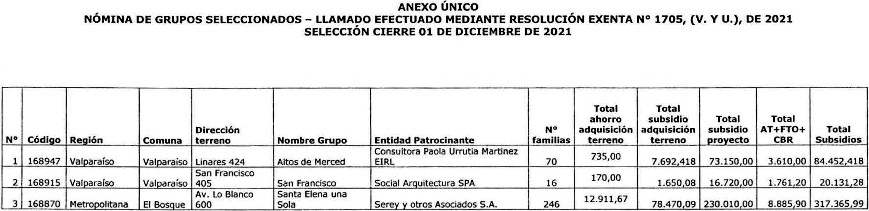 MODIFICA RESOLUCIÓN Nº 1.705 EXENTA (V. Y U.), DE 2021 Y APRUEBA GRUPOS SELECCIONADOS EN EL MES DE DICIEMBRE DE 2021, SEGÚN LO DISPUESTO EN LA RESOLUCIÓN Nº 1.705 EXENTA (V. Y U.), DE 2021, Y SUS MODIFICACIONES, QUE LLAMA A GRUPOS ORGANIZADOS A PROCESO DE SELECCIÓN EN CONDICIONES ESPECIALES PARA EL OTORGAMIENTO DE SUBSIDIOS DEL PROGRAMA HABITACIONAL FONDO SOLIDARIO DE ELECCIÓN DE VIVIENDA, REGULADO POR EL DS Nº 49 (V. Y U.), DE 2011, Y SUS MODIFICACIONES, EN LA ALTERNATIVA DE POSTULACIÓN COLECTIVA PARA LA ADQUISICIÓN DE TERRENOS Y DESARROLLO DE PROYECTOS DE CONSTRUCCIÓN EN NUEVOS TERRENOS