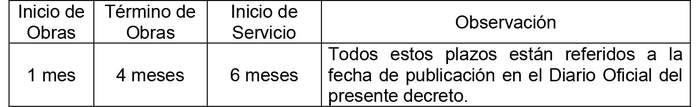 4. Los plazos para el inicio y término de obras e inicio de servicio, son los que se indican a continuación: