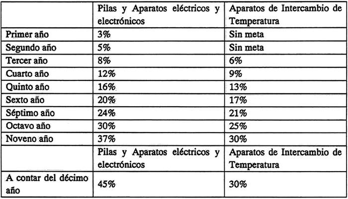 Los productores podrán cumplir la meta para pilas y aparatos eléctricos y electrónicos con cualquier pila o aparato eléctrico o electrónico, incluidos aquellos pertenecientes a la subcategoría Aparatos de Intercambio de Temperatura. No obstante, en caso de introducir en el mercado Aparatos de Intercambio de Temperatura, los productores deberán cumplir además con la meta establecida específicamente para dicha subcategoría.