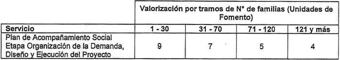 El Plan de Acompañamiento Social que presentará la Entidad Patrocinante incluirá las actividades señaladas, las que deberán ser aprobadas también por el Serviu, pudiendo este impartir instrucciones operativas para el desarrollo de las actividades señaladas durante su ejecución, para el desarrollo de estas labores, los honorarios a percibir por la Entidad Patrocinante por el servicio de "Plan de Acompañamiento Social Etapa Organización de la Demanda, Diseño y Ejecución del Proyecto" en Unidades de Fomento por tramo de familia será el siguiente: