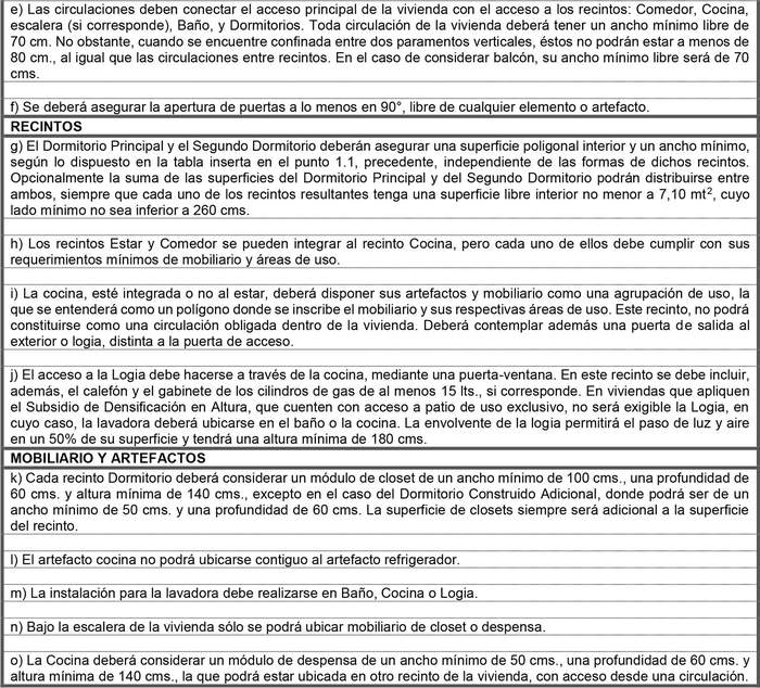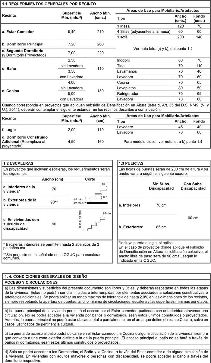 El presente instrumento establece estándares arquitectónicos mínimos para el diseño de las viviendas del Llamado para proyectos de Construcción en Nuevos Terrenos del Programa Fondo Solidario de Elección de Vivienda. Para cada recinto se ha definido una superficie, un ancho y la cabida de un mobiliario mínimo. Los recintos podrán considerar áreas que no cumplan con el ancho mínimo, sin embargo, éstos no serán considerados para el cumplimiento de la superficie mínima. La superficie mínima no puede ser obtenida por medio de la suma de superficies separadas dentro del recinto.