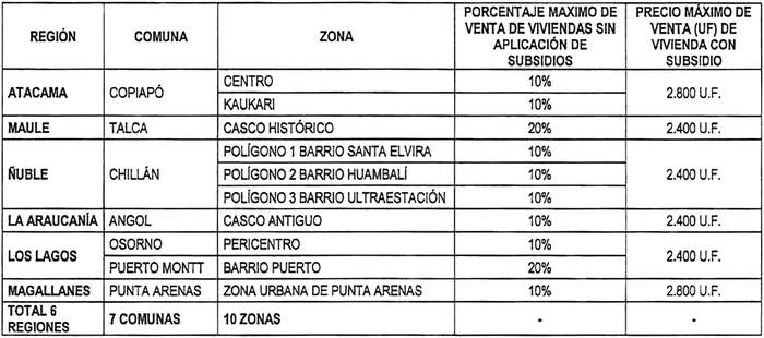 3.1. Los proyectos que se desarrollen en terrenos que se emplacen en alguna de las 10 zonas definidas, podrán considerar un precio de vivienda para venta con aplicación de subsidio, de hasta 2.400 UF o de 2.800 UF, según la región, provincia y comuna, señalada en la letra a) o letras b), c) y d) de la tabla inserta en la letra b) del artículo 3º del DS Nº 19.
