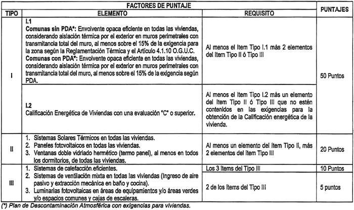 5.3.1. Sin perjuicio de la obligación de cumplir con el mínimo esperado, en caso de incluir otros elementos de eficiencia energética, estos deberán ser evaluados de acuerdo a la siguiente tabla, que detalla lo mencionado en el artículo 11º, Ítem 4. Tipologías de Viviendas, letra F. Eficiencia Energética, del DS Nº 19 (V. y U.), de 2016: