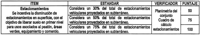 Se otorgará puntaje adicional a los proyectos que presenten estacionamientos vehiculares proyectados en subterráneo (sin contabilizar estacionamientos para motos o bicicletas), permitiendo así el uso prioritario en superficie para zonas de área verde, equipamiento y comercio. El puntaje adicional se considerará en la evaluación, de acuerdo con lo señalado en la siguiente tabla: