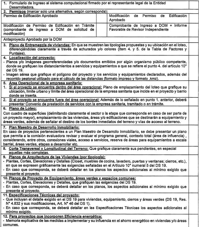 Se efectuará de acuerdo a lo señalado en los artículos 12º y 13º del DS Nº 19. Todos los proyectos deberán cumplir con las condiciones, exigencias y requisitos establecidos en el DS Nº 19 y en esta resolución.