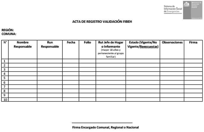 La información recopilada a través de la Ficha Básica de Emergencia Hídrica (FIBEH) tendrá una vigencia de 12 meses a partir de la fecha de encuestaje. Sin perjuicio de lo anterior, la actualización de la información contenida en la ficha realizada con anterioridad a la fecha de vencimiento del plazo ya referido, permitirá extender su vigencia pro doce meses, contado desde la fecha de la respectiva actualización.
