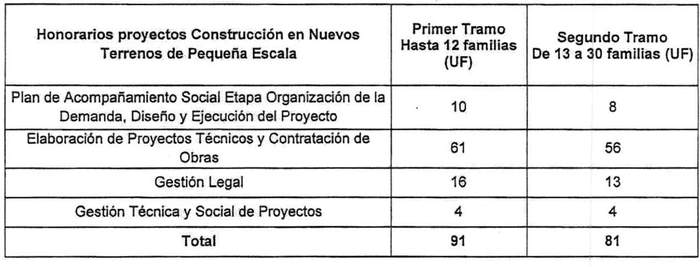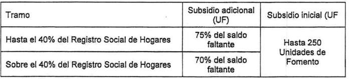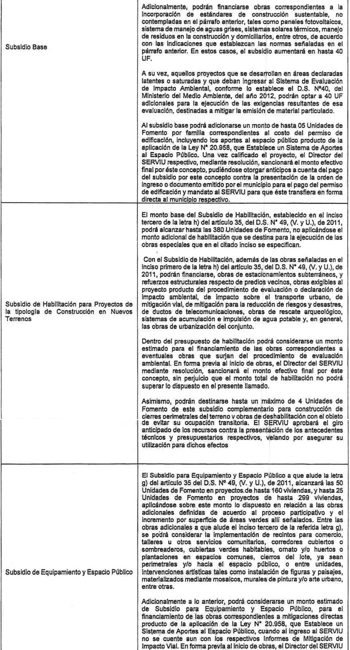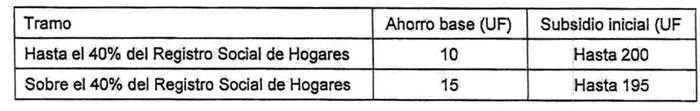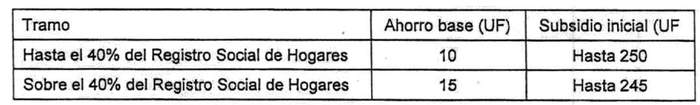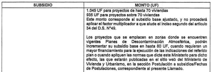 - Modifica en la fila correspondiente al subsidio base, en el sentido de reemplazar la nueva segunda oración por la siguiente: "1.045 UF para proyectos sobre 40 y hasta 70 viviendas".