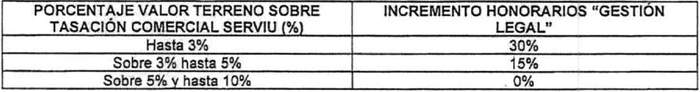 11.5. Los honorarios de Asistencia Técnica correspondientes al servicio "Gestión Legal", se incrementarán con un monto adicional, de acuerdo a la relación entre la tasación del terreno y el precio, según el cuadro siguiente: