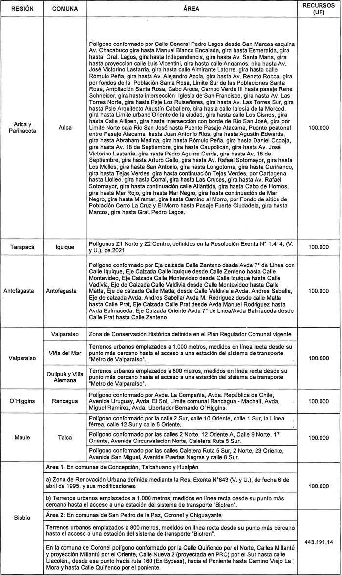 Las letras c y d del numeral 1.2 del numero 1 de la Resolución 609 Exenta, Vivienda, publicada el 19.05.2022, modifica la presente norma en el sentido reemplazar en el Área 2 de la Región de Biobío, el polígono correspondiente a la comuna de Coronel como indica la citada norma asimismo incorpora un monto de 200.000 Unidades de Fomento en la columna "Recursos" para el Área 1 de la Región Metropolitana.