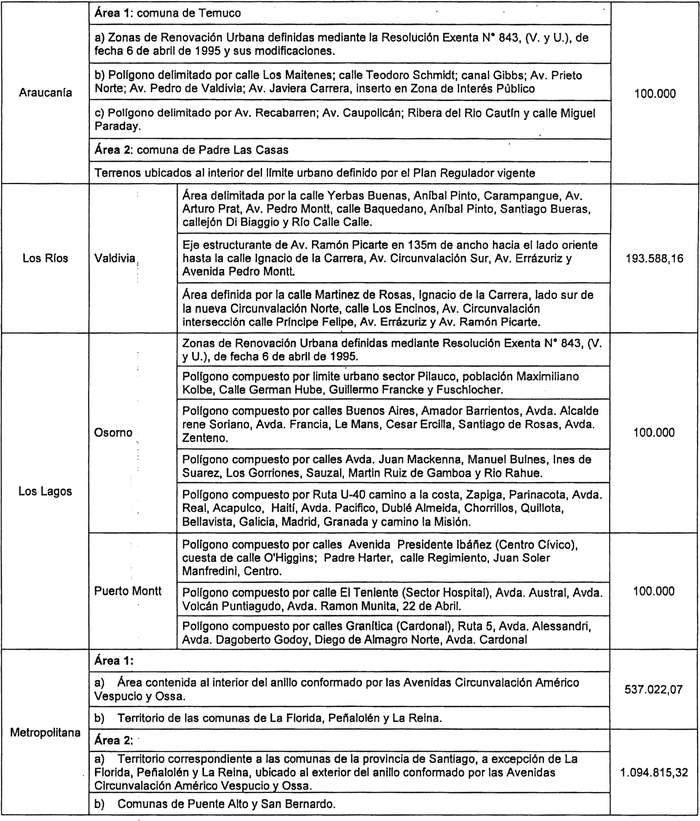 Para acceder a este subsidio, los terrenos a adquirir deberán emplazarse, total o parcialmente, en áreas urbanas o de extensión urbana de los territorios o polígonos señalados en el cuadro inserto en el Resuelvo 3 de esta resolución y contar con norma urbanística vigente para el desarrollo del proyecto habitacional.