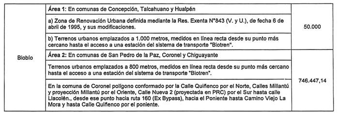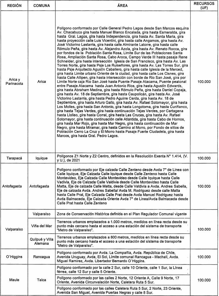 La letra b del numeral 1 de la Resolución 1595 Exenta, Vivienda, publicada el 03.12.2022, modifica la presente norma en el sentido de reemplazar las filas correspondientes a la Región del Maule y la Región de Los Ríos por las que la citada norma indica.