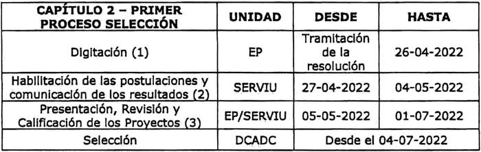 1. Otórgase un nuevo plazo de digitación para el primer proceso de postulación del llamado dispuesto por la resolución exenta N° 413 (V. y U.), de 2022, desde la total tramitación de la presente resolución y hasta el día 26 de abril de 2022.