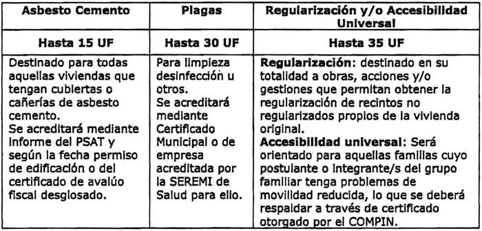 Incremento para asbesto cemento: Hasta 25 Unidades de Fomento para la ejecución de obras de reparación de la envolvente o de instalaciones, que contemplen la remoción de elementos que contengan asbesto cemento. La existencia de elementos que contengan asbesto cemento será acreditada a través del Diagnóstico Técnico Constructivo.