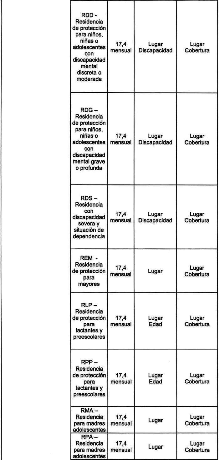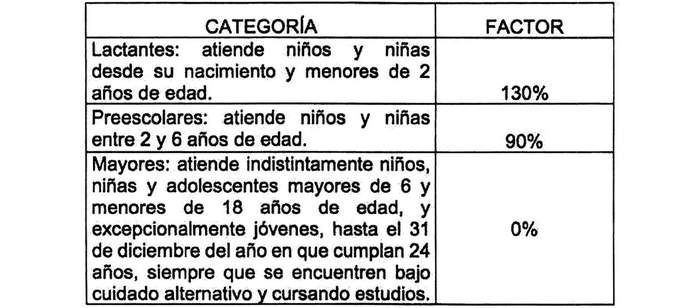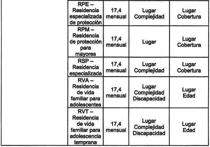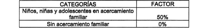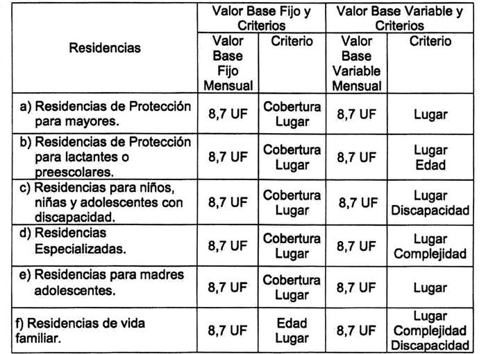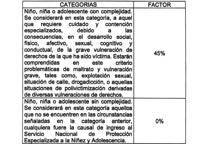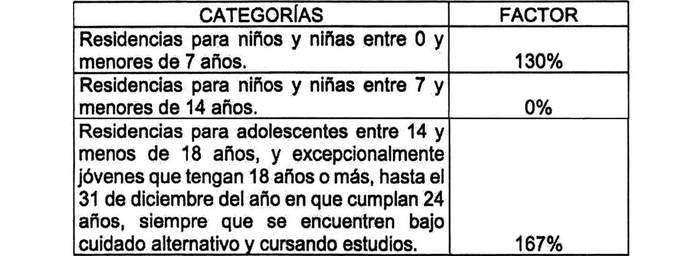 Para efectos de las residencias de vida familiar contempladas en la letra f) de la tabla prevista en el inciso tercero del artículo 15 de este reglamento, la determinación del factor asociado a este criterio deberá aplicar solo en la parte fija de los aportes financieros del Estado, las siguientes categorías: