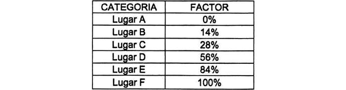 Los factores asociados a cada tipo de lugar serán los siguientes: