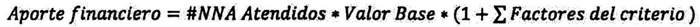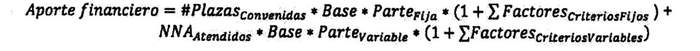 Base * ParteFija hace referencia al valor base fijo, y Base * Parte Variable hace referencia al valor base variable. A ambos se les aplican los factores de los criterios fijos y variables, según corresponda, para el cálculo del aporte financiero del Estado.