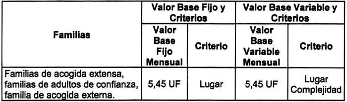 Para efectos del cálculo del valor a que se refiere el inciso primero del artículo 14 precedente, la línea de acción cuidado alternativo del tipo familia de acogida considerará un valor base de 10,9 Unidades de Fomento y los siguientes valores y criterios: