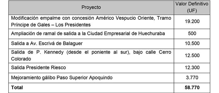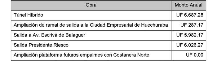 2.12 Por concepto de la ejecución de las obras denominadas "Ampliación de ramal de salida a la Ciudad Empresarial de Huechuraba", "Salida a Av. Escrivá de Balaguer", "Salida Presidente Riesco" y "Ampliación plataforma futuros empalmes con Costanera Norte", se fijó el monto máximo total de UF 594.976 (quinientas noventa y cuatro mil novecientas setenta y seis Unidades de Fomento), neto de IVA. El monto definitivo que reconocerá el MOP por dicho concepto se determinará de conformidad con lo establecido en el literal g) del N° 14 del Decreto Supremo MOP N° 78 de 2019.
