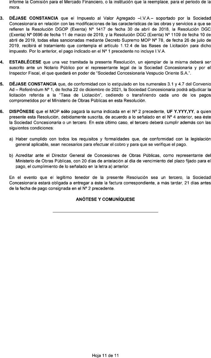 En virtud de lo anterior, el MOP pagará las Resoluciones a su vencimiento al tercero que sea el legítimo tenedor de las mismas o, en caso contrario, a la Sociedad Concesionaria. Estas Resoluciones no podrán ser prepagadas por el MOP, salvo con el consentimiento del legítimo tenedor de la respectiva Resolución, esto es, la Sociedad Concesionaria o el adquirente de éstas.