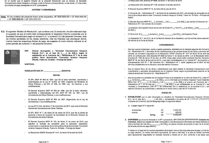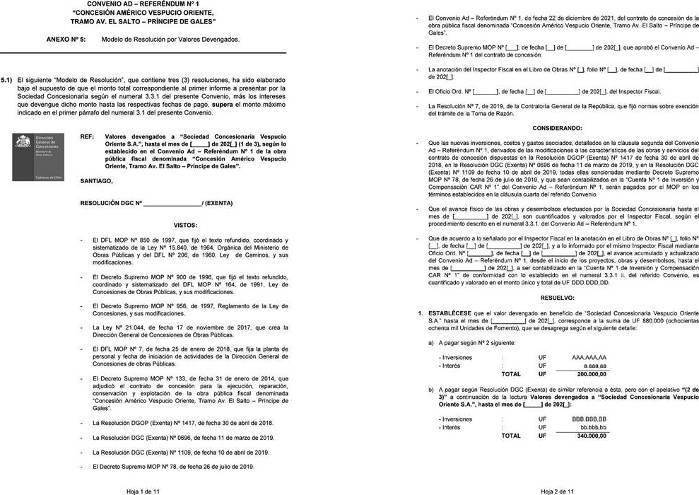 En Santiago de Chile, a 22 días del mes de diciembre de 2021, entre la DIRECCIÓN GENERAL DE CONCESIONES DE OBRAS PÚBLICAS, representada por su Directora General, Sra. Marcela Hernández Meza, ambas domiciliadas para estos efectos en calle Merced N° 753, piso 7, comuna de Santiago, en adelante el "MOP"; y "SOCIEDAD CONCESIONARIA VESPUCIO ORIENTE S.A.", sociedad concesionaria de la obra pública fiscal denominada "CONCESIÓN AMÉRICO VESPUCIO ORIENTE, TRAMO AV. EL SALTO - PRÍNCIPE DE GALES", Rut N° 76.376.061-8, representada por don Luis Manuel Eusebio Iñigo, Cédula de Identidad N° 14.527.678-0, y por don Carlos Antonio Kattan Said, Cédula de Identidad N° 6.379.639-5, todos domiciliados para estos efectos en Av. Américo Vespucio Sur N° 100, piso 16, comuna de Las Condes, en adelante la "Sociedad Concesionaria", se ha pactado el siguiente Convenio Ad - Referéndum, que consta de las cláusulas que a continuación se expresan: