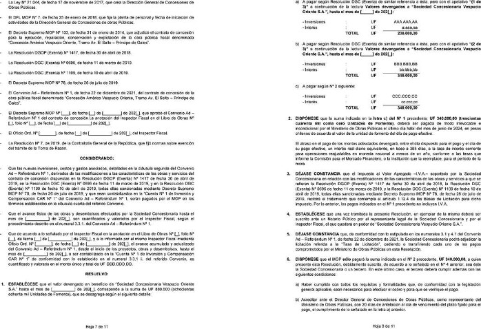 1.7 Las modificaciones a las características de las obras y servicios del contrato de concesión dispuestas mediante Resolución DGOP (Exenta) N° 1.417 de fecha 30 de abril de 2018, Resolución DGC (Exenta) N° 0696 de fecha 11 de marzo de 2019, y Resolución DGC (Exenta) N° 1.109 de fecha 10 de abril de 2019, todas ellas sancionadas mediante Decreto Supremo MOP N° 78, de fecha 26 de julio de 2019, involucran para la Sociedad Concesionaria nuevas inversiones y mayores gastos y costos, todo lo cual, de conformidad con lo prescrito en el artículo 19º de la Ley de Concesiones de Obras Públicas, obliga al MOP a compensarlas, debiendo acordar con la Sociedad Concesionaria las indemnizaciones correspondientes.