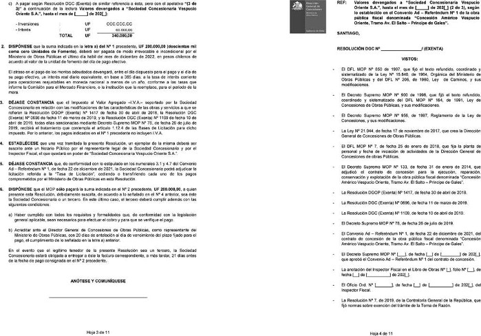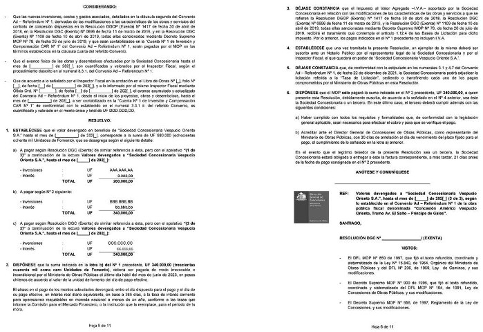 En virtud de la certificación señalada en el párrafo precedente, y dentro del plazo de 10 días contados desde la recepción de esos antecedentes, el Director General de Concesiones de Obras Públicas emitirá una Resolución que reconozca los valores devengados informados por la Sociedad Concesionaria y aprobados por el Inspector Fiscal.