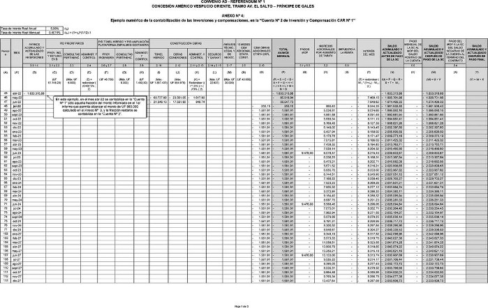 5.11 Para facilitar la comprensión de la contabilización de los montos referidos en la presente cláusula quinta en la "Cuenta N° 2 de Inversión y Compensación CAR N° 1", se adjunta como Anexo N° 4 un ejemplo numérico.