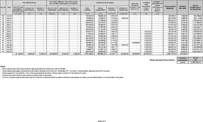 k) El monto por concepto de la ejecución de las obras "Ampliación de ramal de salida a la Ciudad Empresarial de Huechuraba", "Salida a Av. Escrivá de Balaguer", "Salida Presidente Riesco" y "Ampliación plataforma futuros empalmes con Costanera Norte", cuyo monto máximo se señala en el numeral 2.12 del presente Convenio, será reconocido mensualmente de acuerdo a sus respectivos avances de construcción, con fecha del último día del mes en que se efectuó dicho avance, previa aprobación del Inspector Fiscal.