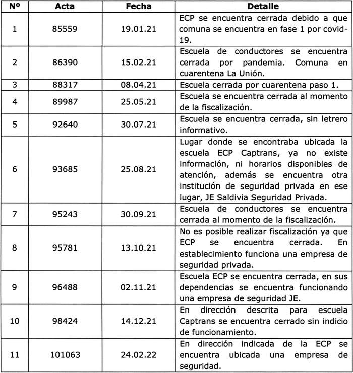 Lo dispuesto en los artículos 6 y 7 de la Constitución Política de la República; los artículos 31 y siguientes del DFL Nº 1, de 2007, de los Ministerios de Transportes y Telecomunicaciones y de Justicia, que contiene el texto refundido, coordinado y sistematizado de la Ley de Tránsito; el DS Nº 251, de 1998, del Ministerio de Transportes y Telecomunicaciones, que establece las normas para las Escuelas de Conductores Profesionales o Clase A; la resolución Nº 249, de 1998, del Ministerio de Transportes y Telecomunicaciones, que delega facultades que señala en los Secretarios Regionales Ministeriales; las resoluciones exentas Nº 847, de 15.10.2015, que aprobó los planes y programas, y Nº 851, de 15.10.2015, que otorgó reconocimiento oficial a la Escuela de Conductores Profesionales Captrans Technology SpA, ambas de la Secretaría Regional Ministerial de Transportes y Telecomunicaciones de la Región de Los Ríos; las actas del Programa Nacional de Fiscalización MTT Nº 85559 de 19.01.21; N° 86390 de 15.02.21; Nº 88317 de 08.04.21; Nº 89987 de 25.05.21; Nº 92640 de 30.07.21; Nº 93685 de 25.08.21; Nº 95243 de 30.09.21; Nº 95781 de 13.10.21; Nº 96488 de 02.11.21; Nº 98424 de 14.12.21; Nº 101063 de 24.02.22; la resolución Nº 7, de 2019, de la Contraloría General de la República, y demás normativa pertinente que resulte aplicable.