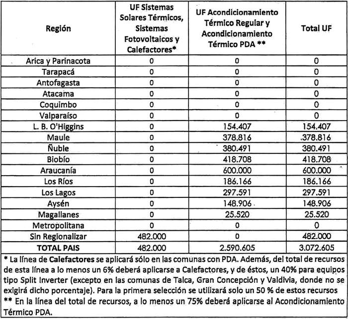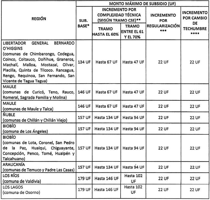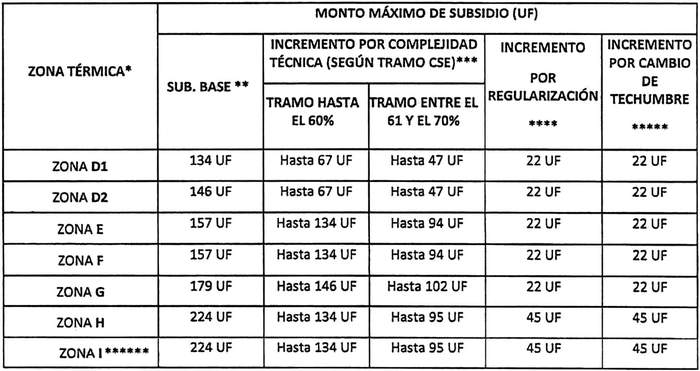 *** Al monto de subsidio de regularización se le podrán adicionar hasta 50 UF, en casos de viviendas que no tengan ningún recinto con recepción final. No podrán postular a este monto adicional las viviendas que hayan sido beneficiadas con un subsidio de acondicionamiento térmico del Programa de Protección del Patrimonio Familiar hasta el año 2015 inclusive.