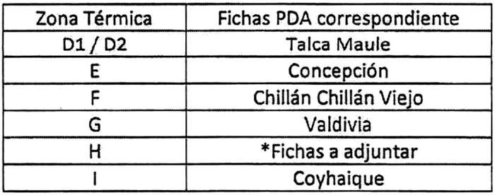 Para acreditar las exigencias de acondicionamiento térmico en techo, muros y pisos ventilados mediante la alternativa de "Fichas de Soluciones Constructivas Minvu" se deberán utilizar las fichas PDA que se encuentren en la provincia de emplazamiento del proyecto. En el caso de no existir un PDA vigente en la provincia se deberán utilizar las fichas que se indican en la siguiente Tabla 1, para cada Provincia y Zona Térmica de emplazamiento del proyecto.