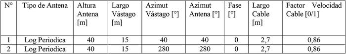 - Arreglo de antenas de acuerdo a la siguiente tabla: