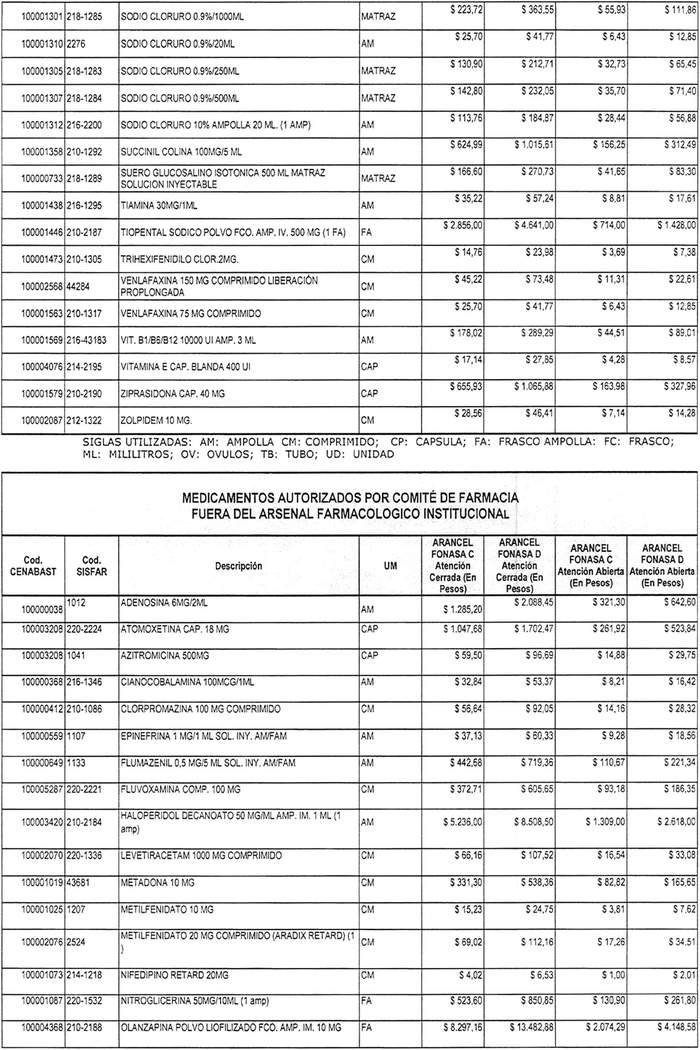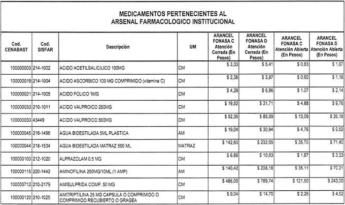 3.- A su vez, el artículo 1° de la Res. Ex. N° 176, de 1999, modificada, entre otras, por la Res. Ex. N° 49 de 09.02.2019, ambas de los Ministerios de Salud y de Hacienda, prescribe que "las prestaciones de salud que se otorguen por los Servicios, Instituciones u Organismos del Sistema Nacional de Servicios de Salud, o por los profesionales, establecimientos y entidades asistenciales de salud, de conformidad con la ley N° 18.469, estarán sujetas para la determinación de su valor al presente Arancel". Enseguida, en lo que concierne al valor de los medicamentos que se suministran, el artículo 15 de la referida resolución señala que "exclusivamente para la atención en la Modalidad Institucional, los medicamentos que corresponda facturar de acuerdo a lo establecido en la ley, deberán ser cobrados por los establecimientos de los Servicios de Salud, basándose en la lista de precios vigente que bimensualmente deberá entregar la Central de Abastecimiento del Sistema Nacional de Servicios de Salud. Aquellos medicamentos que no aparezcan mencionados en esta lista, deberán ser cobrados de acuerdo al costo de reposición";