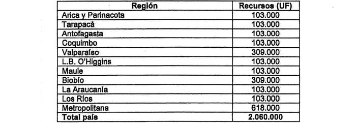 3. El total de recursos para la selección de proyectos postulantes al presente llamado alcanzará por región los montos en Unidades de Fomento que se señalan en la siguiente tablaResolución 923 EXENTA,