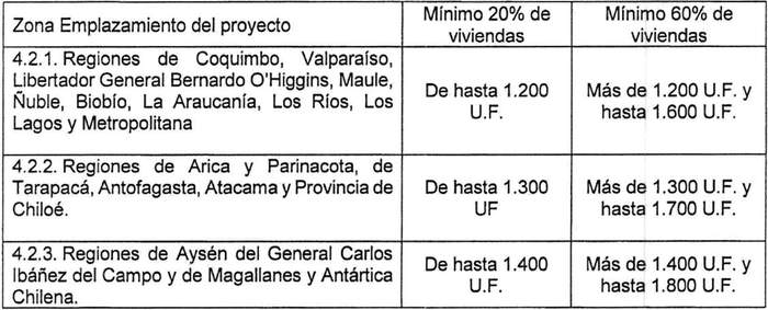 Además, podrá considerarse un tercer tramo de precio de vivienda, dependiendo de la capacidad de financiamiento de la vivienda por parte de los trabajadores y/o de los aportes del empleador, de más de 1.600 UF, 1.700 UF o 1.800 UF, según la zona de emplazamiento, que no podrá exceder del 20% de las viviendas del proyecto, cuyos precios límites será de 2.200 UF para proyectos emplazados en las regiones a que se refiere el numeral 4.2.1 y de 2.600 UF en las regiones y provincia señalados en los numerales 4.2.2 y 4.2.3 de la tabla precedente.