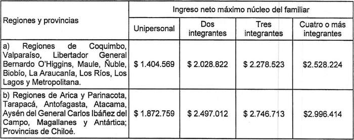 En el caso de trabajadores que estén sobre el 90% más vulnerable de la población de conformidad con la información que se obtenga de la aplicación del Instrumento de Caracterización Socioeconómica vigente, el núcleo familiar declarado en la postulación no podrá tener ingresos netos (ingreso bruto menos impuestos e imposiciones), que excedan de los que a continuación se detallan, en función del número de integrantes del núcleo familiar declarado: