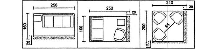 En el caso de la zona de Estar, todas las viviendas deberán considerar un módulo de dimensiones 2,50 x 1,60 mts como mínimo, también deberá considerar circulaciones de ancho libre mínimo 0,70 mts, independientes del módulo Estar.